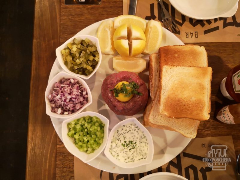 El primer día de nuestra visita, nos sentamos y en menos de 5 minutos teníamos en nuestra mesa un espectacular tártaro con un par de shopitos de Kali. Esta cerveza American IPA (6.5% y 60 IBU) se caracteriza por tener aromas frutales y herbales bastante frescos; en boca es ligera, con amargor punzante y que al final nos deja una sequedad agradable y bastante redonda. Una IPA altamente recomendable como esta marida muy bien con un tártaro valdiviano (uno de los mejores que probamos en Valdivia) que trae 250gr. de carne, cebolla, ají verde, pepinillos, salsa de la casa y tostadas. La variedad de sabores frescos y cítricos que encontramos en la comida hacen un maridaje de complemento ideal para la IPA de la casa; y la carne fresca viene super bien con la astringencia que nos deja cada sorbo, limpiando la boca para un nuevo bocado. Recordaremos por mucho tiempo este tártaro. Es una elección obligada si vas al bar.