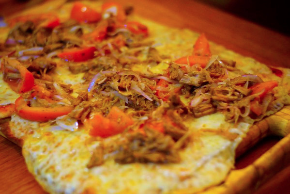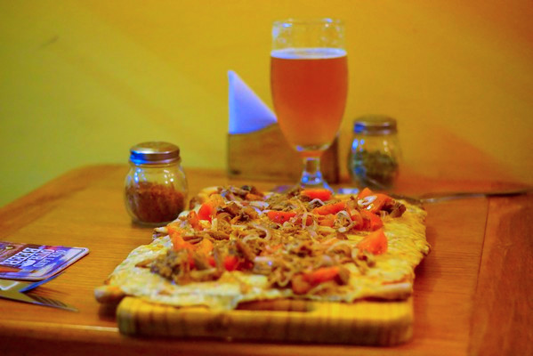 Punto aparte es la comida. Dentro de todas las posiblidades para comer (que son muy variadas) escogimos una pizza de la casa: Pizza La Grifería. Definitivamente, fue la mejor elección. Nos trajeron a la mesa una pizza a la piedra (evidentemente la masa es artesanal) fresca, recién hecha y bien cargadita. Tenía carne mechada, tomate, cebolla y harto queso. La maridamos con una APA de Black Mud, y quedó maravillosa.
